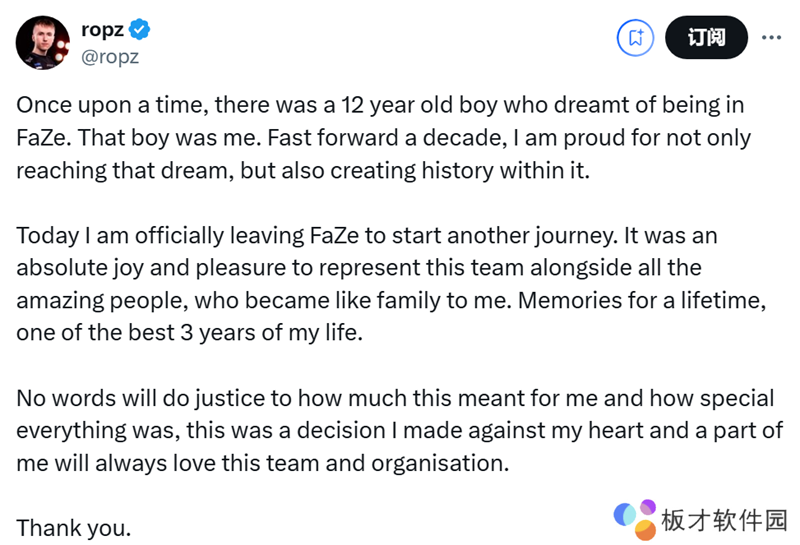 今天早上FaZe俱乐部官宣同队内明星选手ropz分手,而ropz也在刚刚于社交平台上分享了自己离开这家效力三年之久俱乐部的感受。