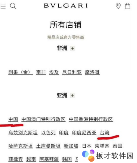 图中为宝格丽官方发货地址,有把台湾作为国家分类区分。