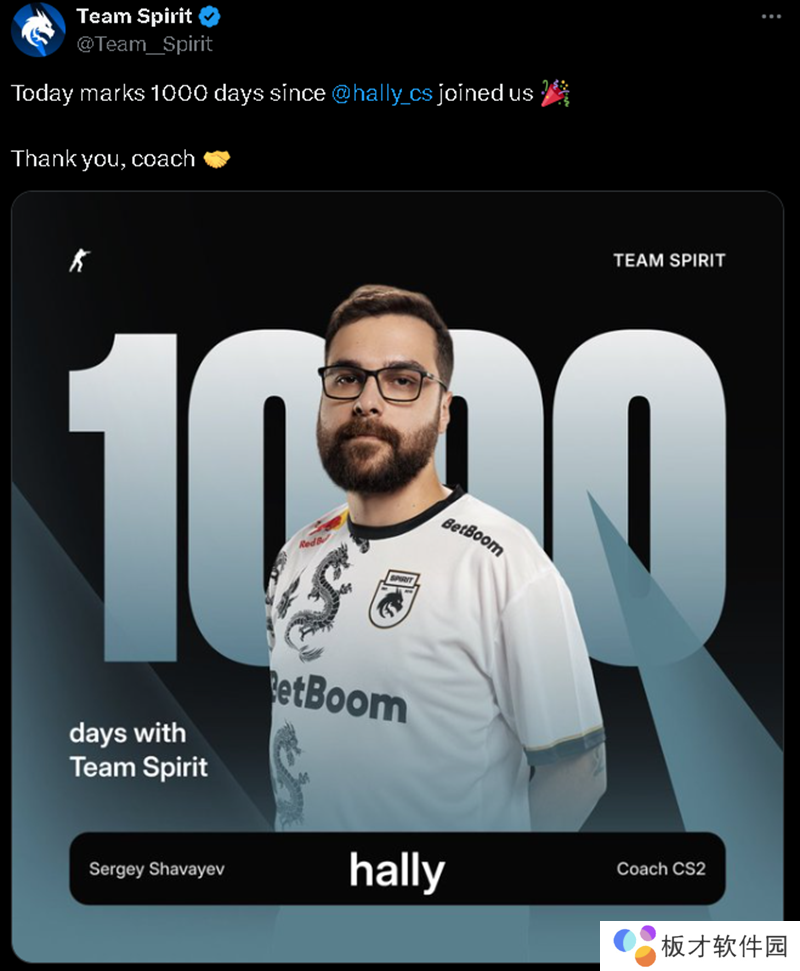 Spirit在BLAST 世界总决赛2024中成功晋级总决赛,而就在今天,队内教练hally达成了执教Spirit一千天的成就。