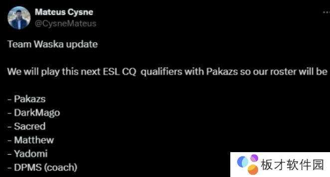 11月12日晚,Waska战队经理Cysne在推特上宣布,前BOOM战队一号位Pakazs正式加盟Waska战队。
