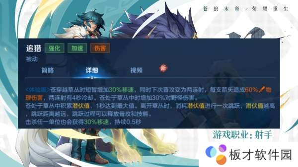 穿越草丛还是可以增加移速,还是可以强化下一次普攻,改为两连射,不过现在没有了叠满几环以后的额外伤害。在草丛里面呆着会积攒潜伏值,出草丛的时候苍会跳一下,潜伏值越高跳的越远,我们可以理解为类似于艾琳被动的那种机制,一次快速突进,算不上位移。