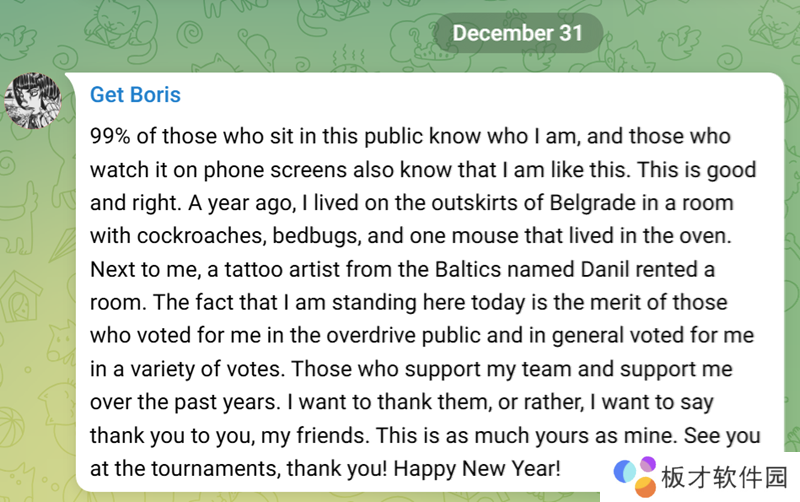 “在座99% 的人都知道我是谁,在手机屏幕前观看的朋友们也了解我。这样很好,也理应如此。一年前,我还住在贝尔格莱德市郊,房间里有蟑螂、臭虫,还有一只住在烤箱里的老鼠。旁边住着一位来自波罗的海地区、名叫Danil的纹身师,他也租了个房间。我今天能站在这里,多亏了在OD社群为我投票的人,以及在各种投票中支持我的人。感谢过去这些年一直支持我和我战队的你们。我想感谢他们,确切地说,我想对你们说声谢谢,我的朋友们。成就既是我的,也是你们的。赛场上见,谢谢大家!新年快乐! ”