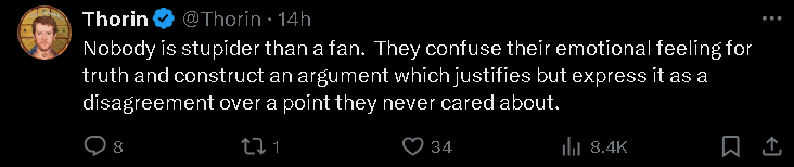 “没有人比粉丝更愚蠢。他们将自身情感与真理混淆。他们构建论点来辩解自己的不同意见,而这些意见原本并不重要。”