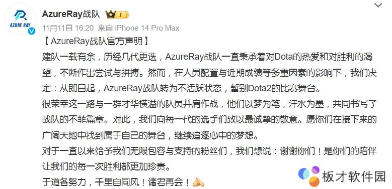 近日,AzureRay战队官方微博发布一条消息,宣布战队进入不活跃状态,暂别Dota2的比赛舞台。原文如下: