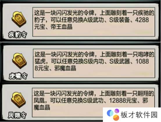 PS:所有的A级武功,S级武功,以及S级内功都可以用令牌换取—疾豹令可以兑换任意A级武功、虎啸令可以兑换任意S级内功、凤翔令可以兑换任意S级武功。