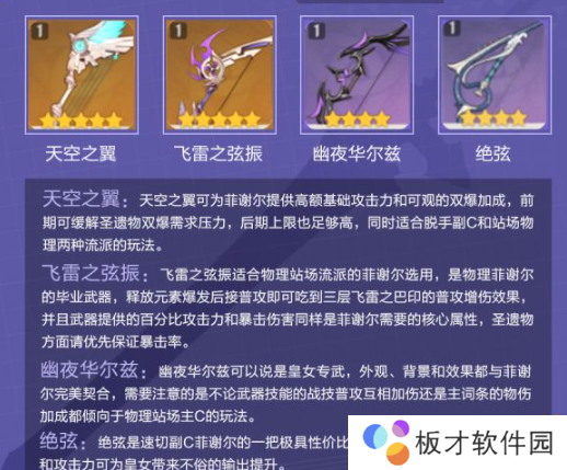 天空之翼可为菲谢尔提供高额基础攻击力和可观的双爆加成,前期可缓解圣遗物双爆需求压力,后期上限也足够高,同时适合脱手副C和站场物理两种流派的玩法。