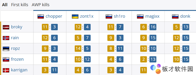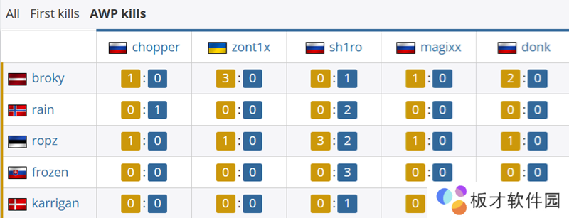 在全部对位数据上,donk全面压制FaZe选手,magixx除了和