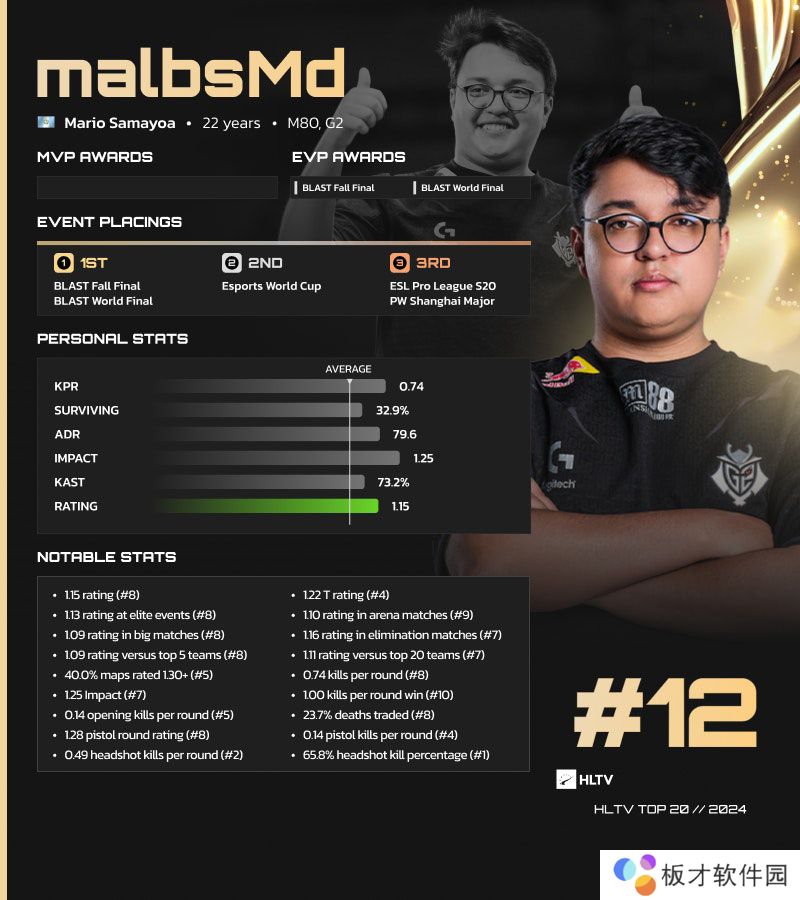 在2024年度HLTV TOP20榜单中,malbsMd是近来北美地区最令人瞩目的天才选手之一,也是唯一一位在自己的祖国危地马拉大红大紫的选手。malbsMd是在七岁时开始接触CS的,当时他在家工作,父亲在闲暇时会看他与机器人对战。他一直跟着父亲玩《反恐精英》,直到父亲不再在家工作,他才离开游戏几年。