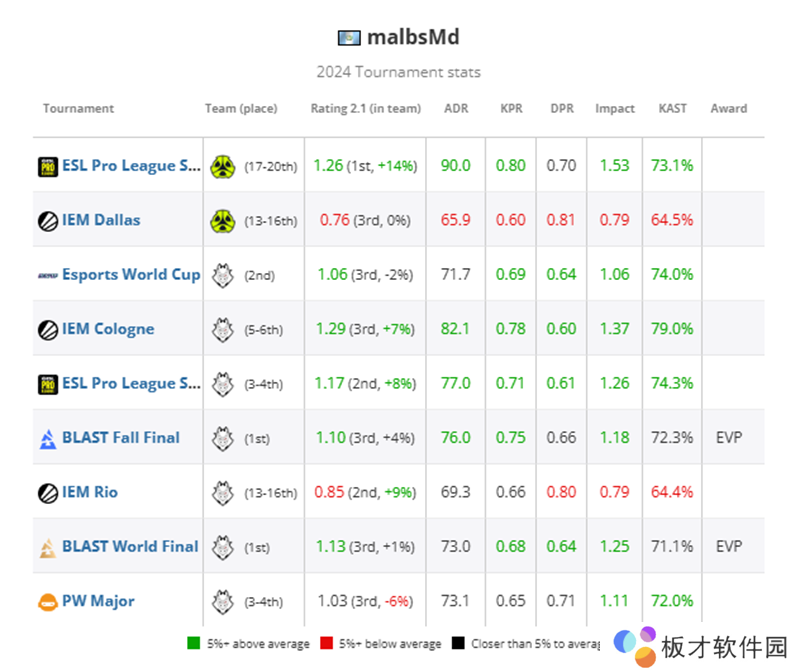 malbsMd今年的Rating为1.15,是目前TOP20选手中并列第二高的选手,比许多排名在他之上的选手都要好,他在大型赛事(1.13,TOP9)和精英赛事(1.13,TOP8)中的Rating都保持在1.15,这要归功于他比大多数人都更经常带飞的能力(40%的地图Rating超过1.30,TOP5)。