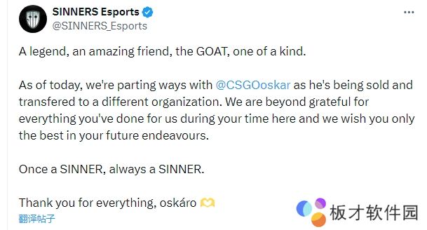“非常感谢你在这里的努力与贡献。祝愿你未来一切顺利,”SINNERS在社交平台上表达了对oskar的感谢。