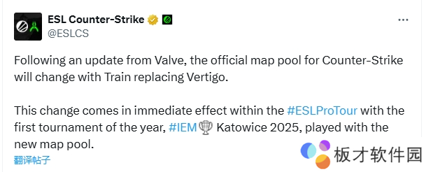这一变化立即生效,将在#ESLProTour中实施,2025年首场赛事IEM 卡托维兹将使用新的地图池进行比赛。”