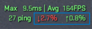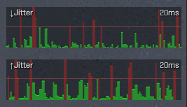 每个图表中间的红线是警告阈值,超过该阈值的抖动更可能导致错过tick。阈值取决于当前手动缓冲量(通过设置 > 游戏 > 缓冲设置,以消除数据包丢失/抖动)。如果数据包在此行上方抖动并变为红色,则表示抖动量相对于当前手动配置的缓冲量较高。这并不一定意味着丢失了tick并影响了游戏操作。