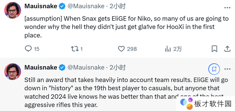 分析师Mauisnake:这仍然是一个在很大程度上考量团队成绩的奖项。在普通观众眼中,EliGE会以年度第19位最佳选手的身份“载入史册”,但任何观看了2024年赛事直播的人都知道,他的表现远不止于此,他是今年最出色的侵略型步枪手之一。