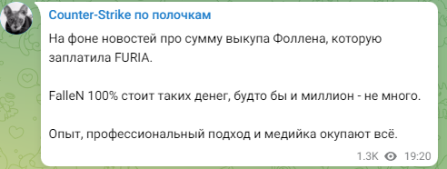 “关于FURIA俱乐部为买断FalleN所花的金额,是100%值得的。因为61万美金并不是一个小数目,但FalleN的职业经验、专业性和媒体曝光流量可以换来一切。”
