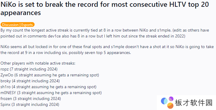 Falcons战队选手NiKo即将打破连续入围HLTV年度最佳选手TOP20的最高纪录,目前最长的连续入围记录是由NiKo和s1mple两人并列的连续8次。(编者注:正如其他人在评论区中指出,device也有连续8次,但由于他的连胜记录已经在2022年结束,所以编者将他排除在外)