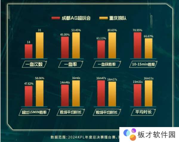 我们再来看看,两支战队的数据对比。在一血的次数,一血率,一血获胜率,超过15分钟的胜率,胜场平均时长,和平均时长这六项数据中,狼队是领先AG超玩会的。AG超玩会仅仅在10-15分钟的胜率和败场平均时长这两项数据是领先狼队的。