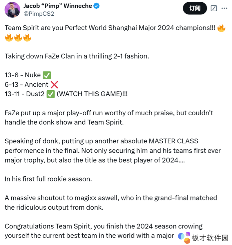 恭喜Spirit,你们在2024赛季结束时以一座Major奖杯为自己加冕,成为目前世界上最好的队伍!