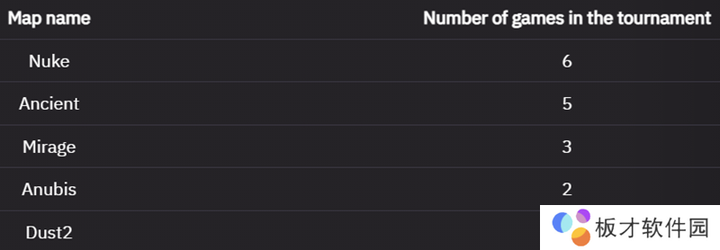 Nuke是淘汰赛阶段最受欢迎的地图,一共出场六次。紧随其后的是Ancient,一共出场五次。第三受欢迎的是Mirage,一共出场三次。