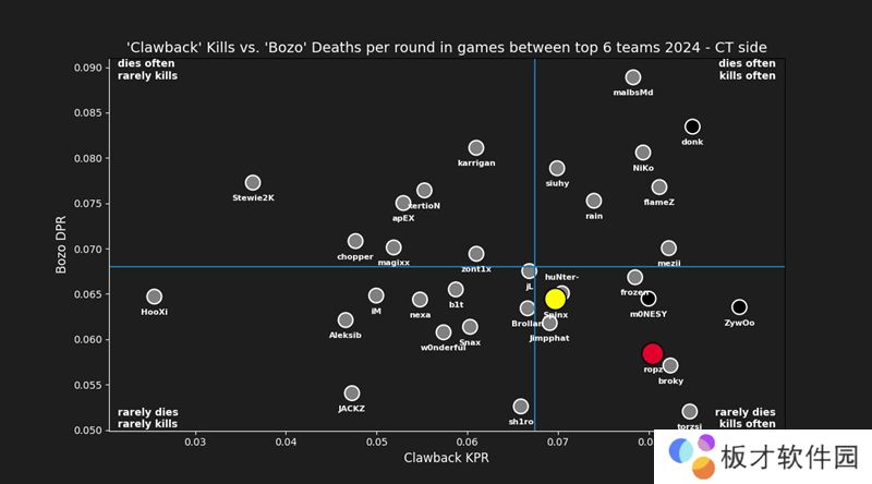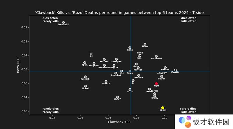 从角色分工上看,ropz与Spinx存在一定的重叠,但两人的风格却大相径庭。根据网友btrams对俩人在残局阶段的表现(在人数优势下阵亡导致输掉回合,以及在人数劣势下击杀对手从而赢下回合)的分析,可以清晰地看到ropz在击杀效率上要优于Spinx。其中在防守端,俩人的差异最大,ropz在今年对阵TOP6队伍时,他能够用更少的死亡换取更多的击杀,而Spinx的风格则略显莽撞,经常在队伍手握人头优势的情况下冒进而丢分。而在进攻端,两人的击杀效率相差无几,但Spinx的存活率更高。