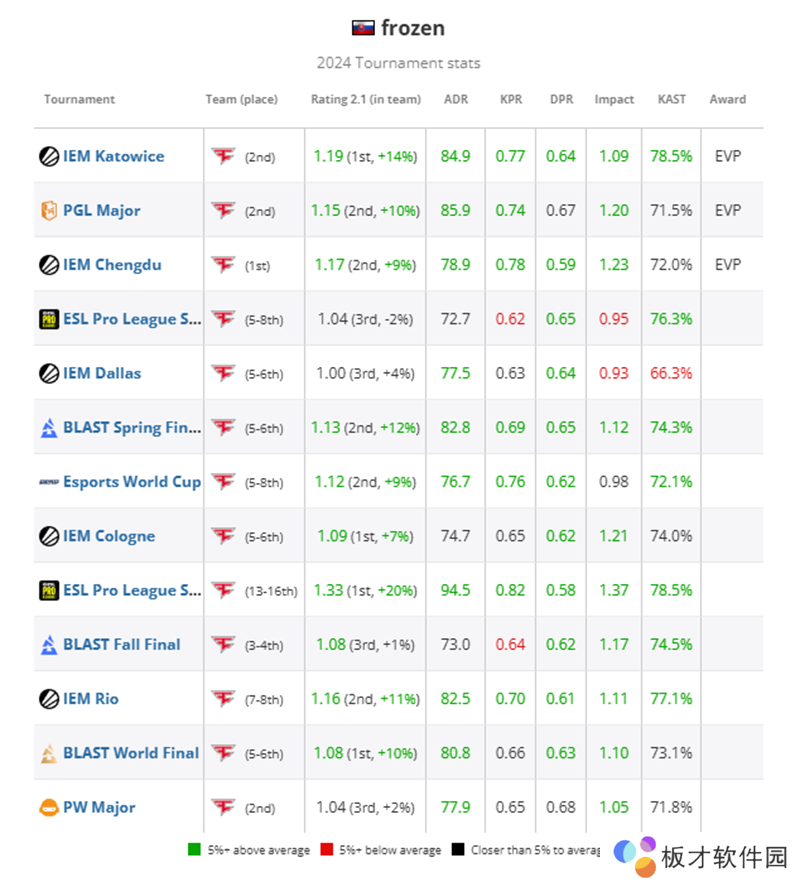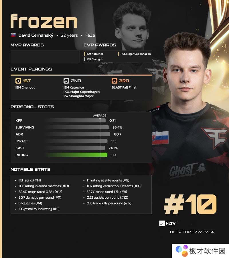 frozen连续第三次跻身TOP20榜单,因为他在参加的每项赛事中都表现出了无与伦比的水平,获得多个EVP称号,每次平均Rating都在1.00或更高。