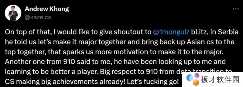 “此外,我还要向bLitz致敬。在塞尔维亚,他告诉我们说让彼此一起打进Major,一起将亚洲CS重新推向顶峰,这让我们更有动力打进Major。另一位蒙古队员910对我说,他一直都很钦佩我,并在学习成为一名更优秀的选手。非常尊重910从dota转战CS,并且已经取得了很大的成就!一起加油吧!”