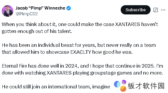 Pimp:如果你仔细想想,你会发现XANTARES并没有充分发挥他的天赋。多年来,他一直是个个人实力强大的选手,但从未真正加入过一个能够让他展示自己真正实力的团队。Eternal Fire在2024年表现出色,我希望他们在2025年能继续保持这种状态。我已经厌倦了看XANTARES参加小组赛,期待他有更多的突破。他仍然有机会加入国际队伍,想象一下