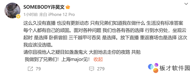 somebody:这么久没有直播 也没有更新动态 只有兄弟们知道我在做什么 生活没有标准答案 每个人都有自己的顽固。面对各种问题 我们也各有各的选择 行到水穷处,坐观云起时 是选择 卧薪尝胆 三千越甲可吞吴 是选择。放下直播 重返赛场也是选择 这次我应该没选错。