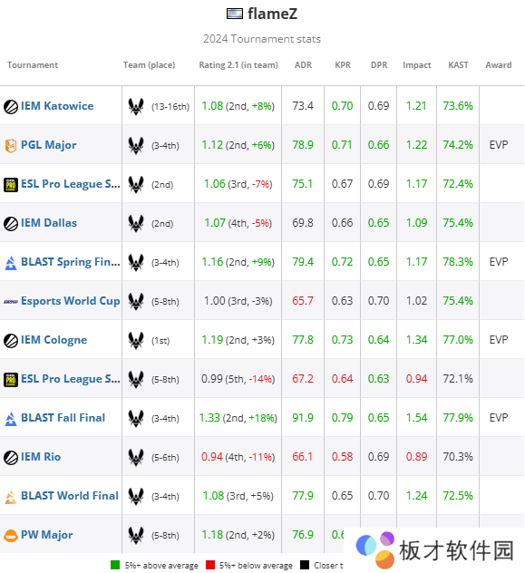 Virtus.pro后早早出局,flameZ今年首次错失VP或EVP提名,最终rating为1.00,五张地图中有三张表现不佳。