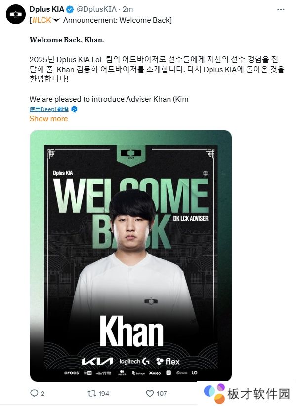 “我们很高兴为您介绍队内顾问Khan,他将在 2025 年与 Dplus KIA LoL 团队分享他的玩家经验。 欢迎回到 Dplus KIA!”