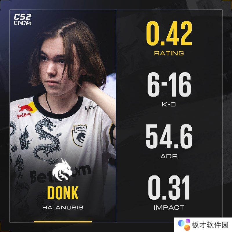 G2三图横扫,屈居亚军。本场比赛中,备受关注的俄罗斯天才步枪手donk在图二Anubis哑火,仅打出0.42 rating、54.6 ADR和6-16 K-D全队倒数第二数据。而这也是他职业生涯打出的线下赛第三差单图数据。