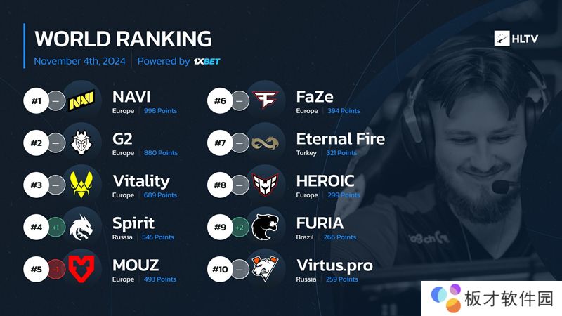 当我们对比HLTV所颁布的世界排名来看,情况则是有所不同。火力值强大的MOUZ取得的成绩明显不尽人意;而