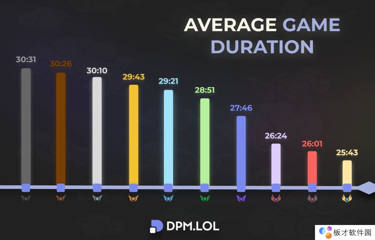 直播吧11月14日讯 外媒统计英雄联盟各段位平均游戏时长,黑铁、青铜、白银段位对局平均游戏时长均超30分钟。