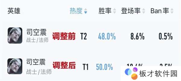 调整后仅一周时间,司空震出场率大涨10%,巅峰赛胜率从48%上涨5-%,绝对算得上一次史诗级加强。