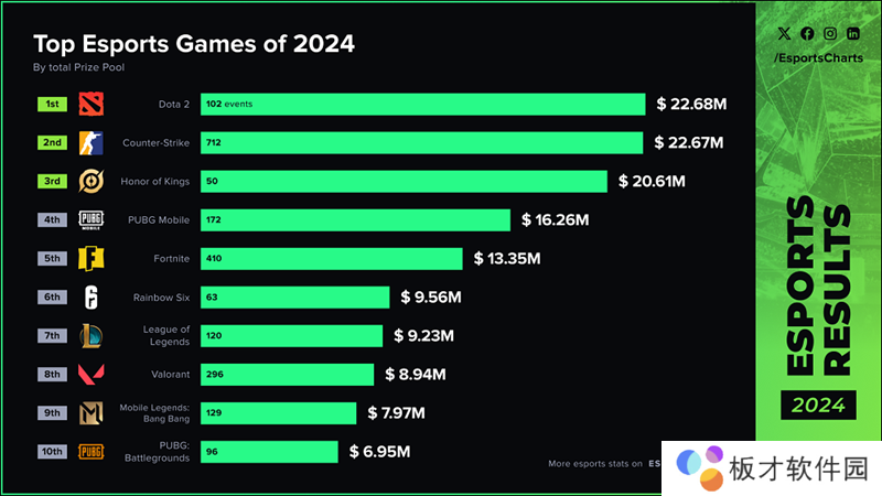 另外根据分析门户网站Esports Charts的数据,CS在今年电竞赛事奖金池方面位居第二。参赛队伍累计获得了超过2267万美元的奖金。2024年奖金池排名第一的是DOTA2,在过去的一年中,该项目在102场比赛中发放了2268万美元的奖金。