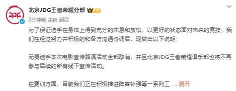 为了保证选手在身体上得到充分的休息和放松,以更好的状态面对未来的竞技,我们在经过努力并积极的和各方沟通协调后,现做出以下说明:无畏选手本次电影宣传路演活动全部取消,并且北京JDG王者荣耀俱乐部也将不再参与后续的所有线下宣传活动。在赛训方面,目前我们正在积极推进阵容补强等一系列工作,相关细节正在有条不紊地落实,在转会期大家可以看到我们具体行动。我们和大家的心愿一样,都希望队伍日益强大,和大家一起赢得更多的荣耀。衷心的感谢每一个粉丝的支持和理解,我们会以更加积极的态度对待大家的反馈,我们明白大家的期待,请大家相信北京JDG王者荣耀分部未来会以更好的面貌和大家见面!