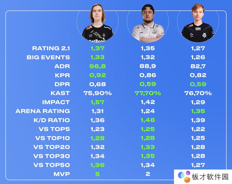 相较之下,EVP的统计三人稍显不同。ZywOo共斩获7次EVP,而m0NESY和donk分别为5次和3次。然而,EVP在TOP1的评选中只是次要因素,应该无法撼动donk的领先地位。