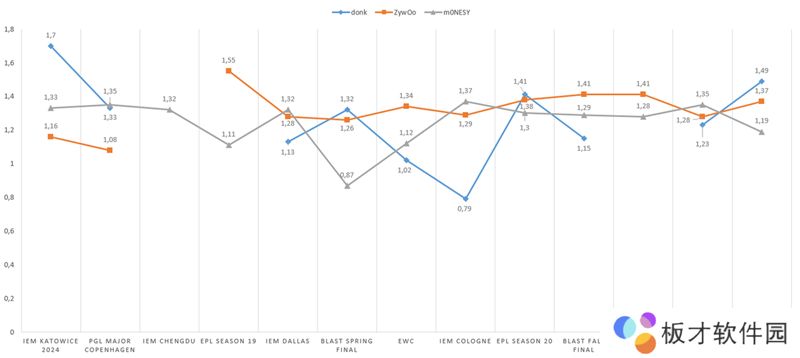 然而,稳定性成为了donk争夺TOP1的唯一短板。与m0NESY和ZywOo相比,donk的Rating曲线波动较大,甚至一度跌至0.79。此外,由于种种原因,他缺席了三场重要赛事,这无疑对年度综合Rating产生了一定影响。