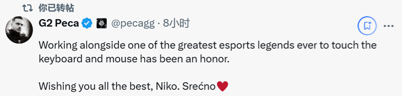 peca(G2战队经理):能与电竞史上最伟大的传奇选手之一共事,实乃荣幸,他在键鼠操作上的造诣令人赞叹。