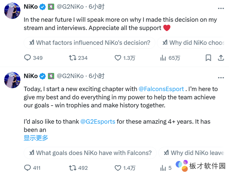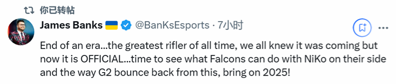 Banks:一个时代落幕了……NiKo是史上最伟大的步枪手,我们都知道这一天迟早会来,但如今它正式发生了…… 是时候看看有了NiKo助力的Falcons能取得怎样的成绩,以及G2战队又将如何从这一变故中强势反弹,2025年,放马过来!