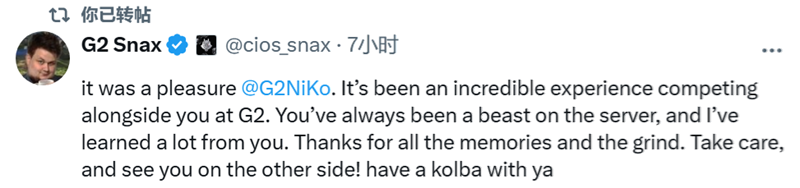 Janusz Pogorzelski | Snax:与你共事是种荣幸。在G2与你一同征战,是段难以置信的经历。你在赛场上一直勇猛无比,我也从你身上学到很多。感谢那些回忆与共同奋斗的日子。保重,咱们江湖再见!愿你一切顺利。