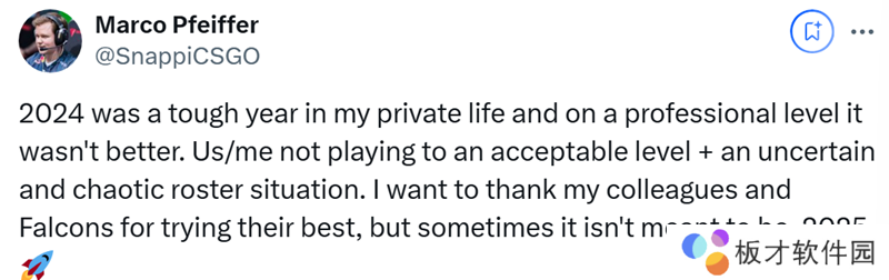 ENCE时期的精彩发挥。0.85的平均rating和无缘Major赛事让他在Falcons战队的经历颇为惨淡,最终他在11月底被队伍下放。Snappi也在社交平台上写道:“无论是个人生活还是职业生涯。2024年对我来说都很艰难。我们和我个人的比赛表现未达可接受水平,而且阵容情况也充满混乱和不确定性。我要感谢我的队友以及Falcons战队尽了最大努力,但有些事有时就是事与愿违。2025年冲冲冲。”