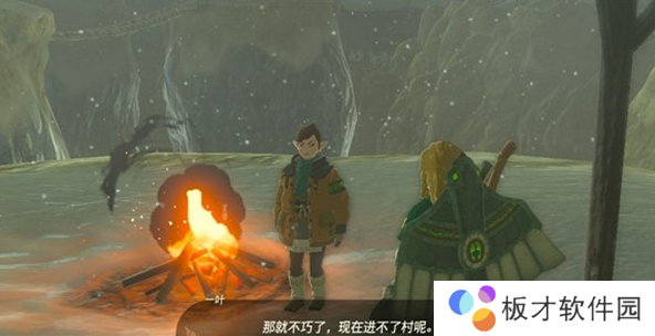 2、不过想要进入利特村的桥梁断掉了,这里需要利用风流飞过去,在这里会看到一叶在篝火旁边,我们丢进海拉鲁球果进篝火堆里。