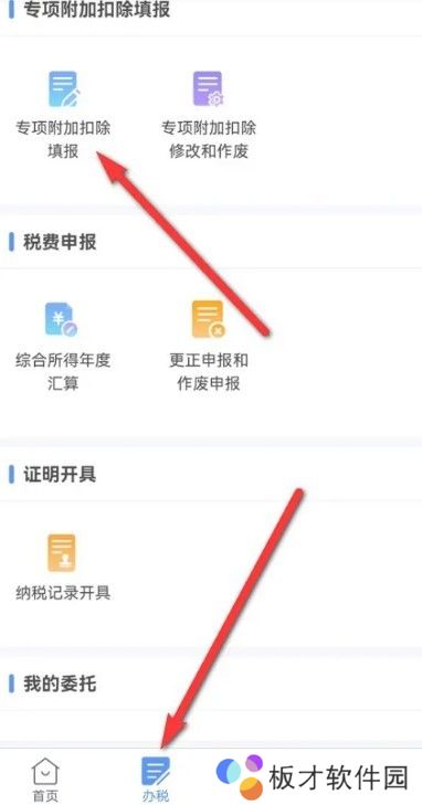 1、首先开启个税APP,进入到主页面选择【办税】,找到【专项附加扣除填报】;