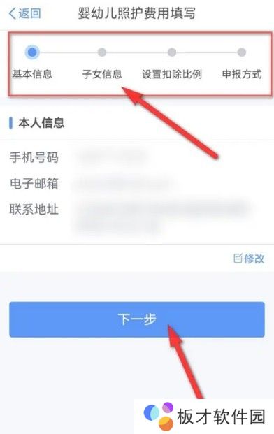 5、最终在婴幼儿照护费用填写页面,按照步骤点击【下一步】填写即可完成。