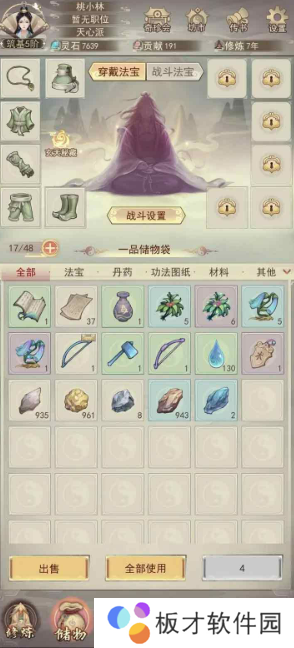 ④用赠送的资源升到7级聚灵阵,坊市—珍宝阁购买五行灵器并装到洞府聚灵阵上,然后安排仆役肉木互升,记得点满队列;