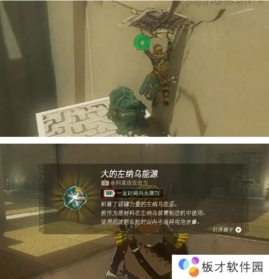 5、爬到树立的木头的顶部,我们朝着宝箱平台滑行,打开后就能获得【大的左纳乌能源】。