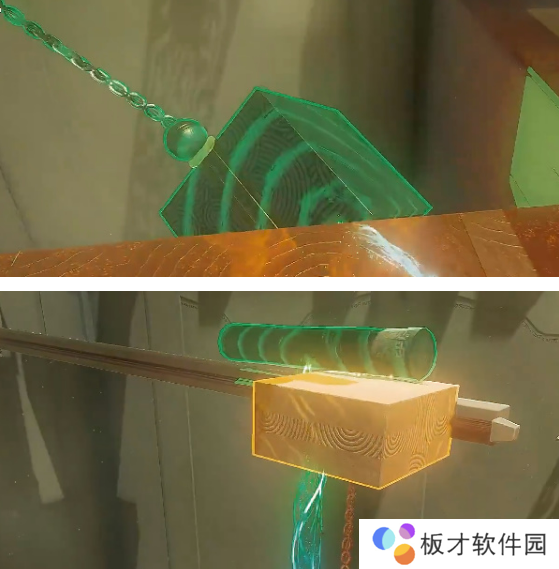 7、利用底部惯性,带动顶部的木棍击中中央区域。