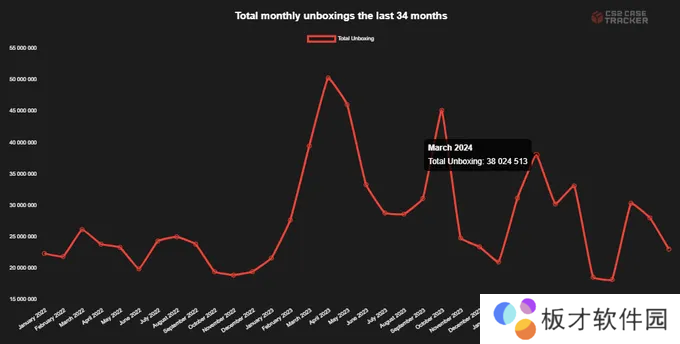 其中,3月份开箱数最多,超过3800万个,7月份最少,仅有1800万个箱子被打开。尽管开箱总数减少,但CS2的平均开箱价格却提高了,单箱利润也增加了。