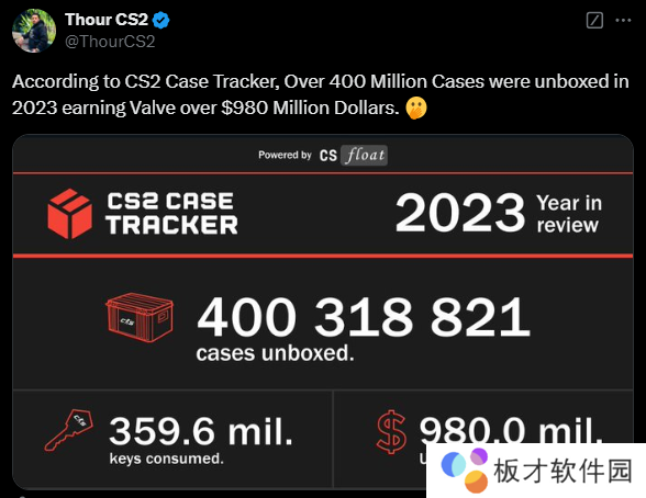 根据去年数据挖掘者Thour CS2的消息,2023年开箱量超过4亿个,为Valve带来了超过9.8亿美元的收入。