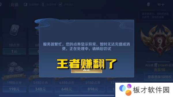 上图就是充值系统崩溃的图片,能看到,显示服务器繁忙,出现这个情况的原因只有一个,就是参与活动的玩家实在是太多了,导致王者荣耀的抽奖服务器一时间出现了卡顿。